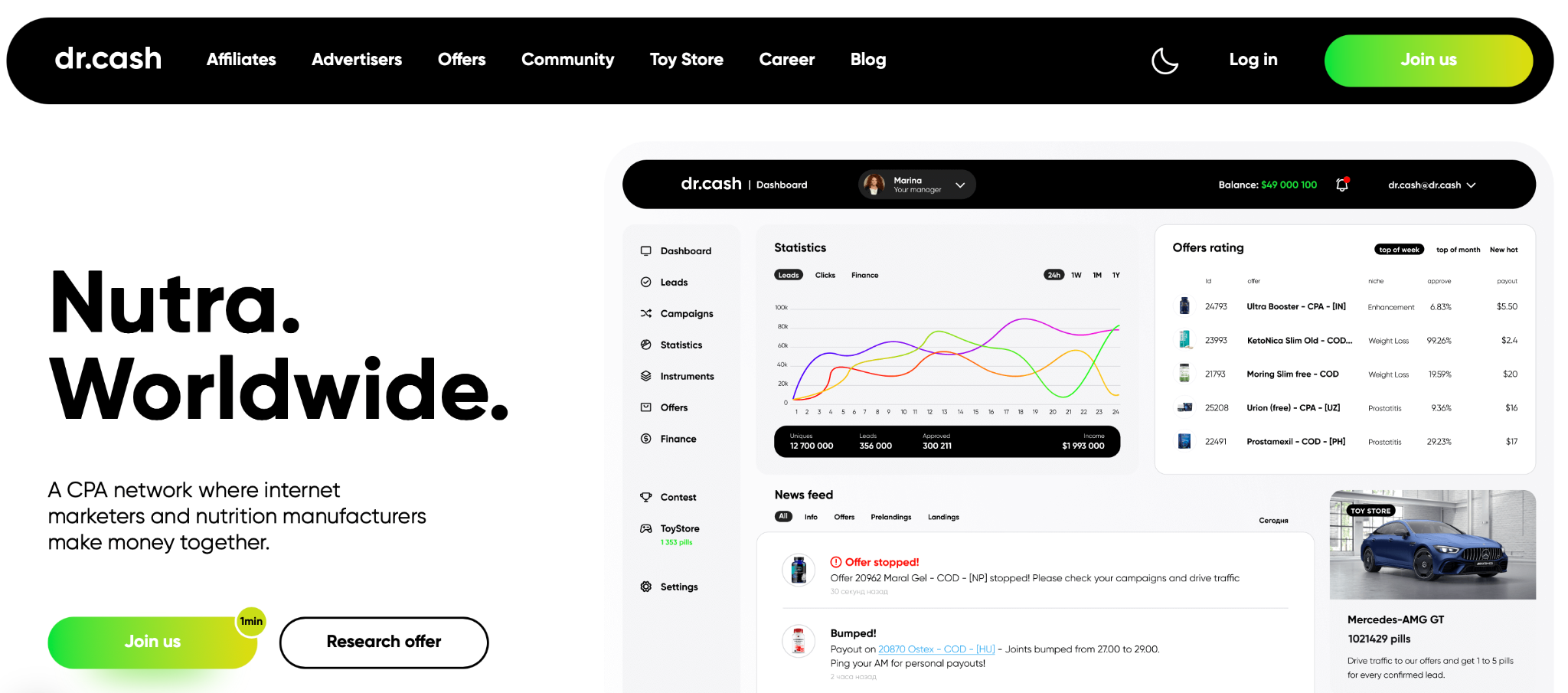 dr.cash — одна из лучших партнерских программ со специализацией на нутра-вертикали. Для работы вебмастерам доступны более 55 субвертикалей в области красоты и здоровья: снижение веса, антивозрастная косметика, варикоз, паразиты, суставы, гипертония и так далее. Так же имеются и WhiteHat офферы.
