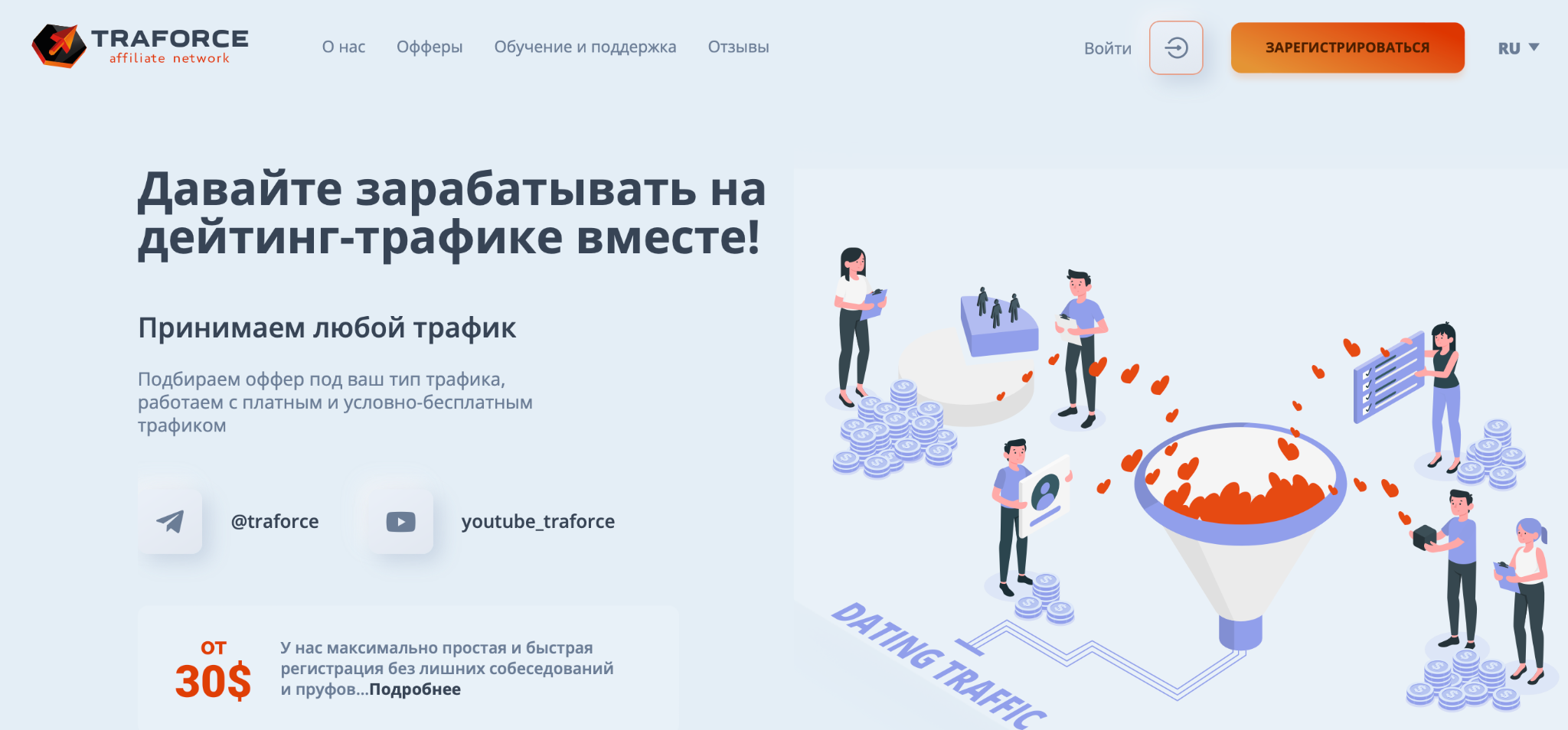 Traforce — моновертикальная партнерская программа, которая предлагает заливаться на дейтинг в любых его проявлениях, сегментах и нишах. Аффилиаты здесь найдут офферы и смартлинки под все типы трафика и гео, топовые EPC по странам их tier-1 и СНГ. Кроме этого, есть бампы выплат до х5 от стартовых, высокие рейты по PPL до 15$.