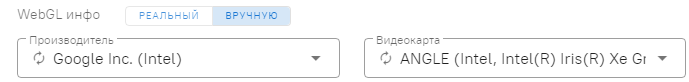 - WebGL инфо. Если вы поставите значение “Реальный”, система покажет реального производителя и модель вашей видеокарты. Поставив параметр вручную, вы сможете самостоятельно их задать. Лучше всего поставив вручную, оставить параметры, которые показывает антик. Но можно также нажать на круговые стрелочки в полях и антик подберёт новые модели и производителей, которые гармонируют между собой, с Canvas и WebGL.