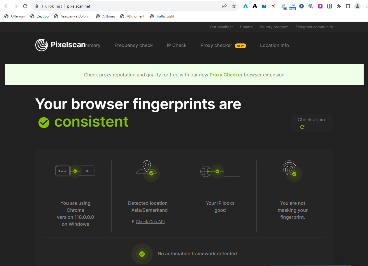 Настроив антидетект, нужно проверить его на ☝️ качество подмен. Достаточно определить, выглядит ли браузерный отпечаток естественно. Сделать это несложно с помощью популярных чекеров.