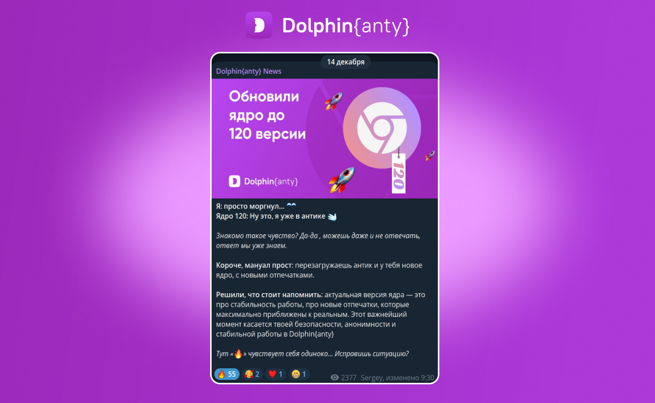 Мы часто пишем, что первыми обновляем ядро Chromium в Dolphin anty и всегда оповещаем об этом своих пользователей. Например, последнее обновление ядра Chromium до 120 версии мы выкатили 14 декабря 2023 года.